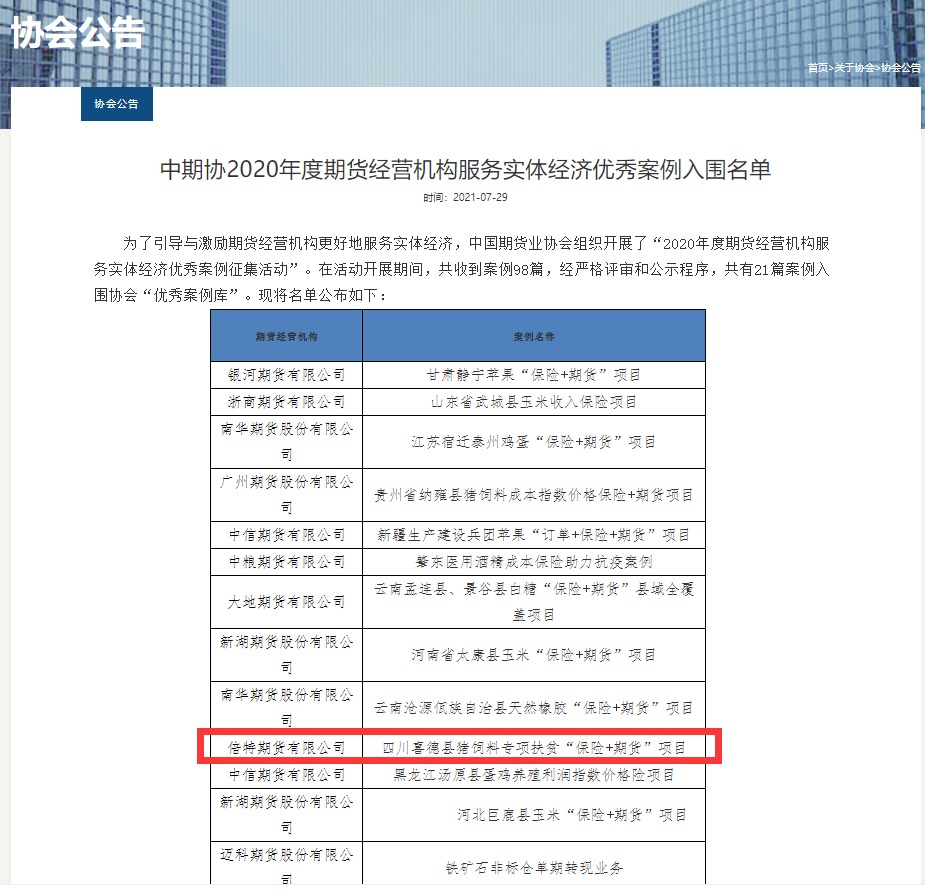 2021年7月29日,中國期貨業協會公布了“2020年度期貨經營機構服務實體經濟優秀案例入圍名單”,協會經過嚴格評審,在征集的98篇案例中給予了21篇案例入圍協會“優秀案例庫”,倍特期貨榮譽登榜!瀏覽 : 8877分享