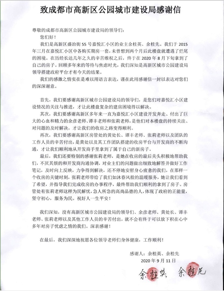 近日,由成都倍特建筑安裝工程有限公司承建的嘉悅匯A標段,歷經多方努力,已基本完成了小業主的交付工作。2020年9月11日,高新發展法務部借調到公園局的張莉同志收到來自嘉悅匯小業主余桂先、余桂英兩位女士贈送的繡有“為民解憂、盡職盡責”、“思民生、解民難、做實事、暖民心”的錦旗及表揚信。兩位業主對張莉同志所提供的服務給與了高度的贊揚和誠摯的感謝。瀏覽 : 12531分享